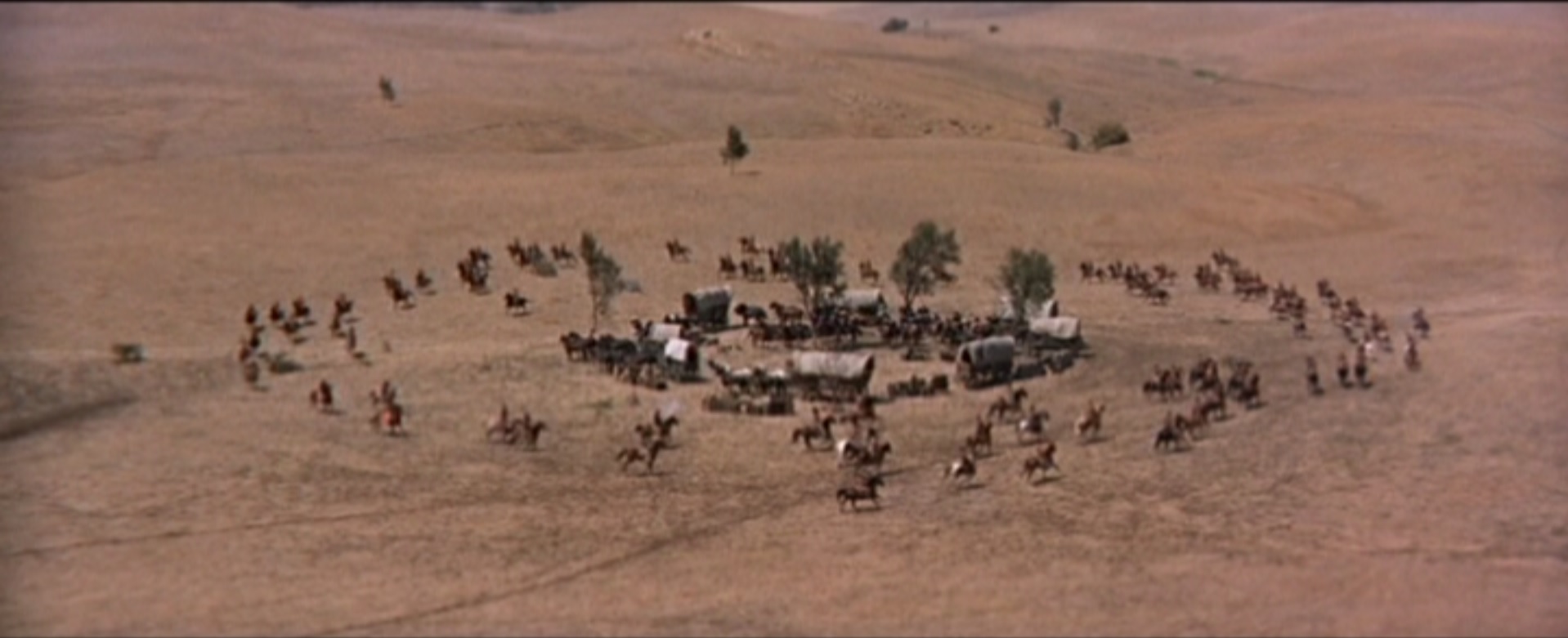 thecommand_4I remained somewhat perturbed, indifferent and bored throughout much of The Command, even the action sequences… until the finale. The Doc comes up with a plan to overcome the huge raiding party of Indians that have stalked the Army caravan throughout the film. The Doc has read the late cavalry commander’s book on tactics, but this plan is a daring move that the Doctor devised himself, so if it fails he’ll be completely to blame for the deaths of those that trusted him. It all comes together in a thrilling action sequence, brought to vivid life with gorgeous location shooting, a nice widescreen image (The Command was Warner’s first CinemaScope picture, too), and a whole lot of arrows and running horses and covered wagons. It’s a fantastically mounted finale, one that makes me wish the whole movie was produced and directed with such gusto. If you’re a fan of classic Westerns, The Command is an interesting one, but not especially great. I’d still cautiously recommend it to fans of cavalry films, though.